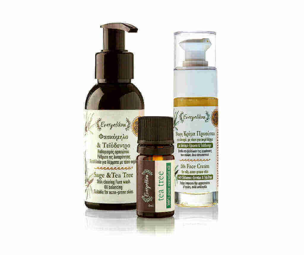 Deze crème bevat tea tree en Griekse kruiden "Dictamos - Erontas". De milde antiseptische Dictamnus en tea tree etherische olie vullen elkaars helende eigenschappen perfect aan. Tea tree staat al lang bekend om zijn sterke antibacteriële, antimicrobiële en antiseptische eigenschappen en wordt al lang gebruikt om huidproblemen te behandelen. Samen met Dictamnus heeft het een krachtig effect op de geïrriteerde huid, kalmeert het en vermindert het ontstekingen. Deze crème is rijk aan effectieve oliën zoals druivenpitolie, extra vierge "Kretan" olijfolie, zoete amandelolie, die de gezichtshuid verzachten en glad maken.
